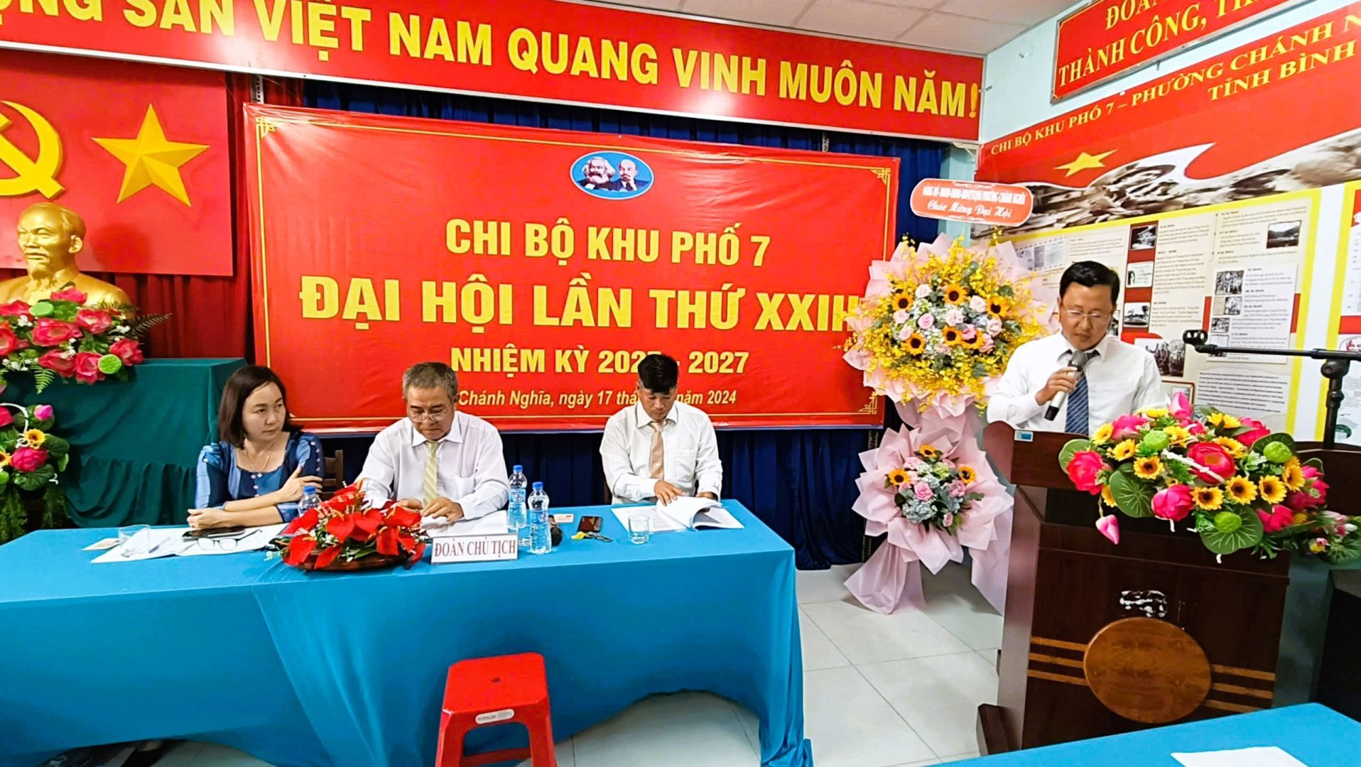 Với tinh thần khẩn trương, nghiêm túc và trách nhiệm, Đại hội Chi bộ khu phố 7, nhiệm kỳ 2025-2027 đã diễn ra thành công tốt đẹp. Đại hội đã bầu chi ủy mới gồm 03 đồng chí, ông Nguyễn Tứ Lâm tái đắc cử Bí thư chi bộ Khu phố 7, Phường Chánh Nghĩa, đ/c: Bành Thị Ngọc Loan - Phó Bí thư./.